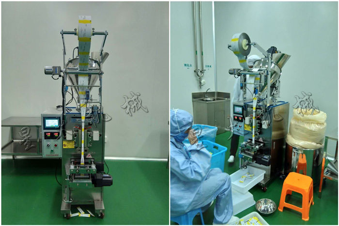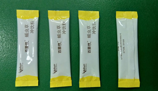 食用菌沖飲粉小袋包裝成品 食用菌沖飲粉包裝機設有自動打印批號或生產日期功能,包裝成品上切易撕口。食用菌固體沖飲粉自動包裝機的計量螺桿由步進電機驅動可獲得極高的重復精度,生產材料全部選用不銹鋼制成,與物料接觸部位采用的是316不銹鋼,完全符合醫藥GMP要求。