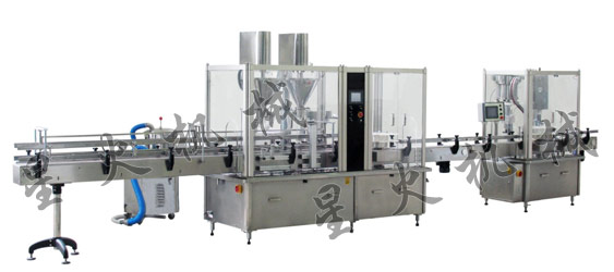 粉末灌裝旋蓋流水線集粉末充填旋蓋、電磁感應封口、雙面貼標、噴碼等功能為一體,自動完成粉末的充填包裝過程。該聯動線為顆粒粉狀等物料自動計量灌裝旋蓋貼標流水線,具有自動送罐、上料、計量、灌裝、旋蓋、封口、貼標、噴印等功能。所有與物料接觸部分均為不銹鋼,整線由PLC控制,伺服電機計量,具有精度高、速度快、貼標、噴碼清晰準確等優點,適用于大多數粉末產品和特別產品的灌裝、旋蓋、貼標等包裝.