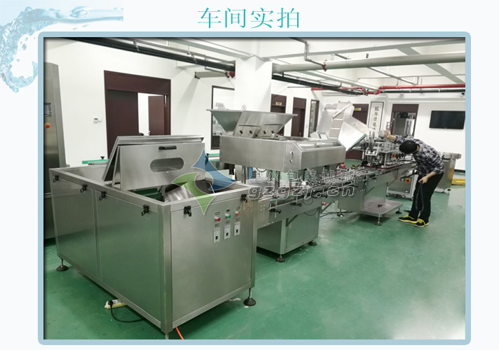 該生產線由全自動理瓶機、全自動多頭數片(粒)灌裝機、自動上蓋旋蓋機、電磁感應鋁箔封口機、自動貼標機組成;適用于對塑料圓瓶,扁瓶的理瓶將雜 亂無章的瓶子倒入儲瓶箱內,瓶子經過輸送及理瓶,使瓶子直立有序地進入灌裝機輸送線,該臺機器設備的使用大大減輕了操作工的勞動強度,是真正意義 上的完全自動生產線。